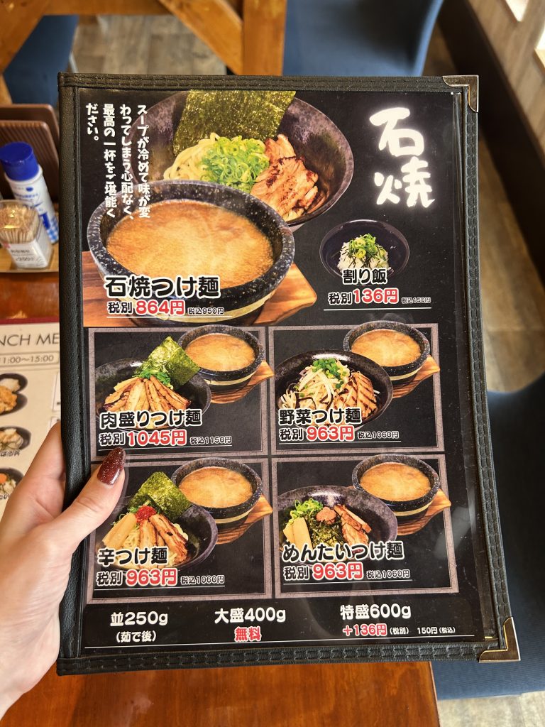 メニューはこんな感じ。石焼きつけ麺にのほかにも、醬油・塩・鶏白湯ベースのラーメンもあります。