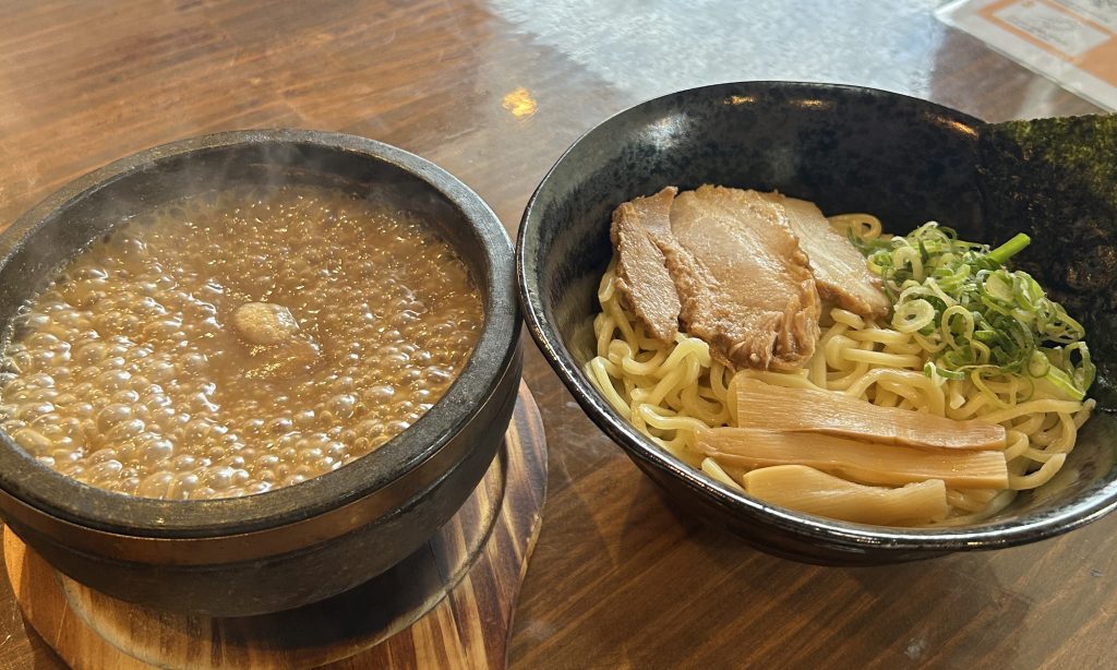 こちらのお店では、なんとも珍しい、熱々の石鍋で提供されるつけ麵がいただけるんです!