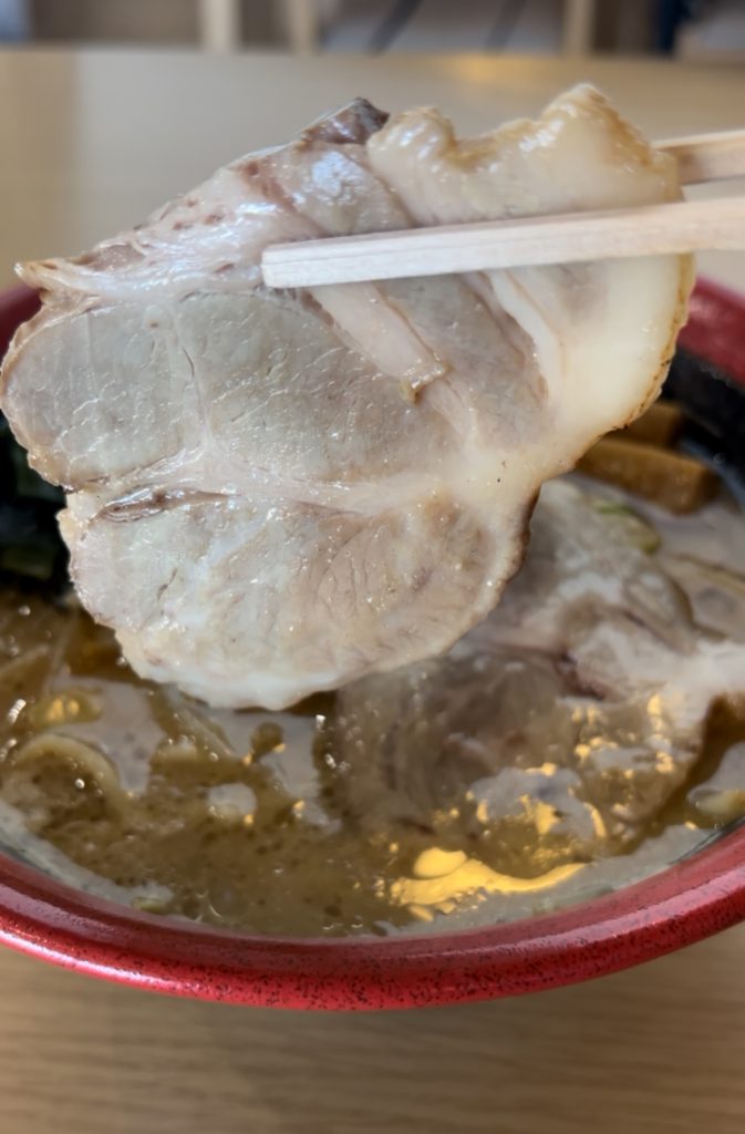 見るからに濃厚な味噌ラーメンには、上に大ぶりなチャーシューがトッピング。香ばしい香りに食欲をそそられます~。