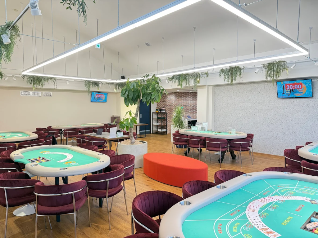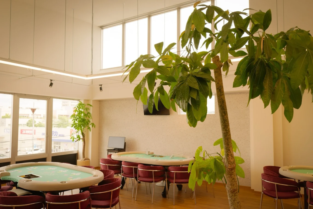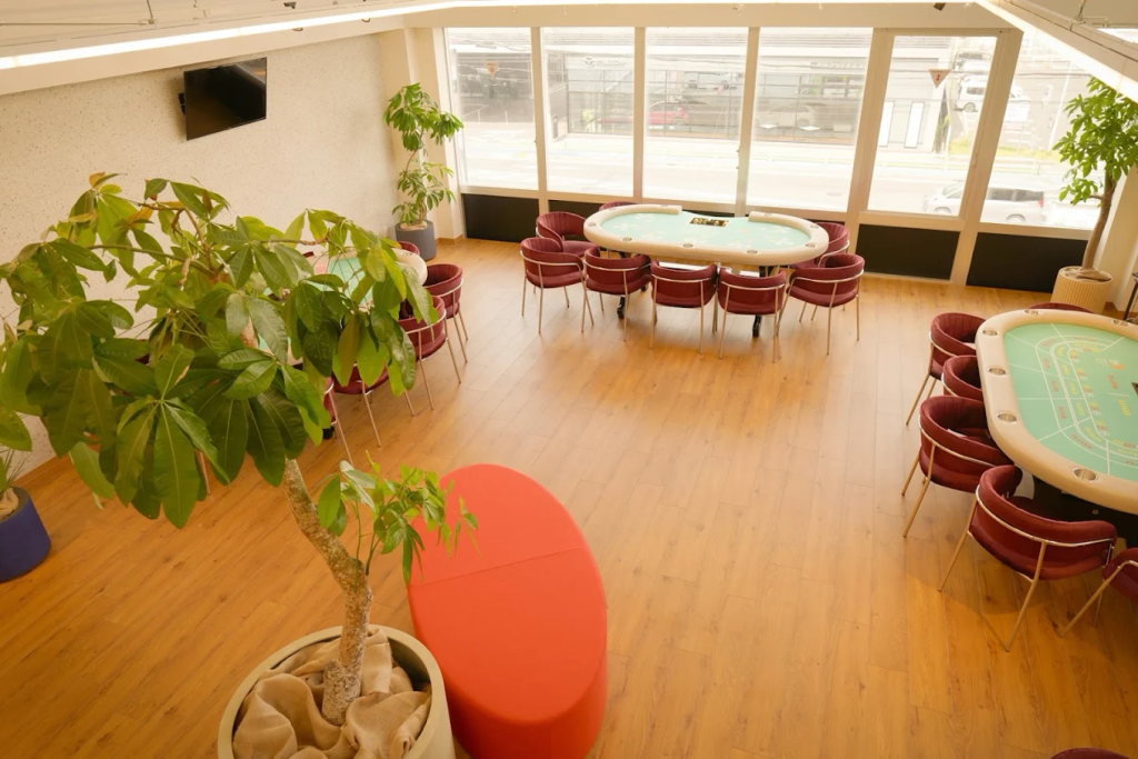 「アミューズメントカジノバー」と聞くと、薄暗い店内をイメージするかもしれませんが、こちらは大きな窓や観葉植物があり、明るく開放的な雰囲気◎