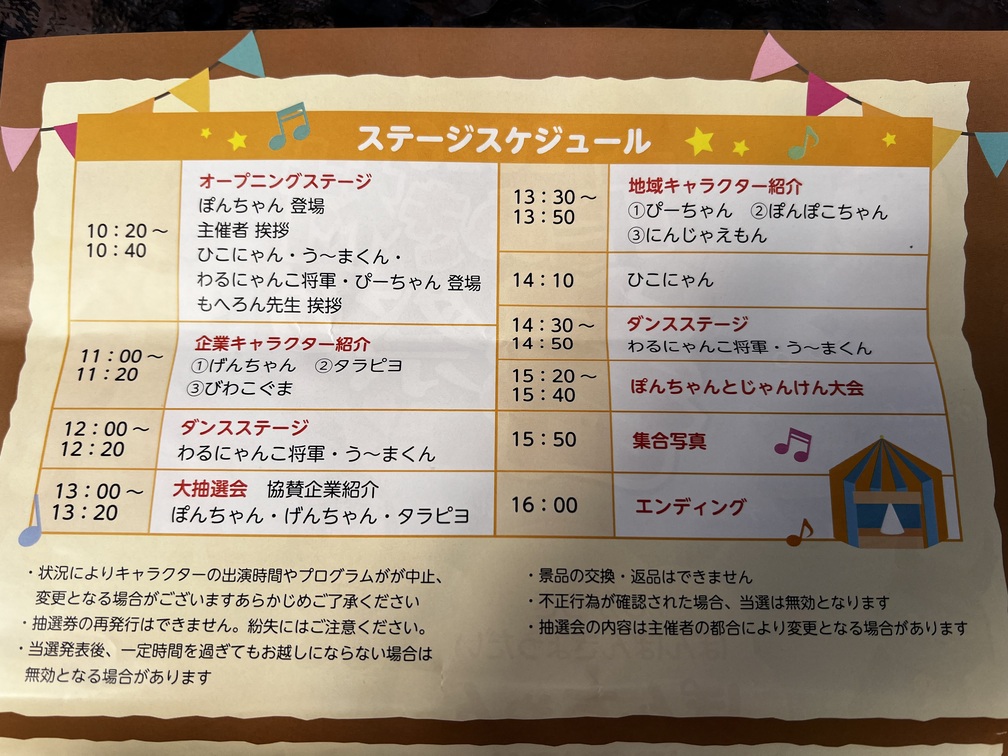 タイムスケジュールはこんな感じ。集まったキャラクターの紹介やダンス、抽選会など盛りだくさんな内容でしたよ
